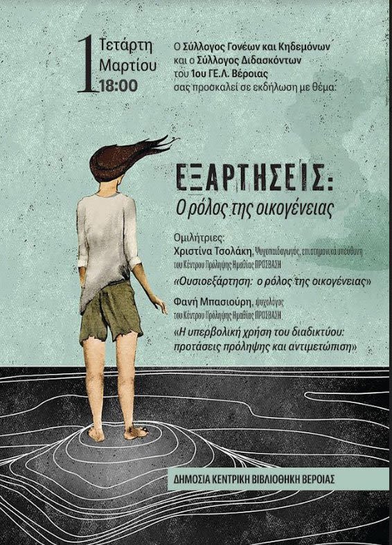 Ο Σύλλογος Γονέων και Κηδεμόνων και ο Σύλλογος Διδασκόντων του 1ου ΓΕ.Λ. Βέροιας σας προσκαλεί σε εκδήλωση με θέμα: ΕΞΑΡΤΗΣΕΙΣ: ο ρόλος της οικογένειας, την Τετάρτη 1 Μαρτίου, στις 6 το απόγευμα, στην αίθουσα εκδηλώσεων της Δημόσιας Κεντρικής Βιβλιοθήκης της Βέροιας