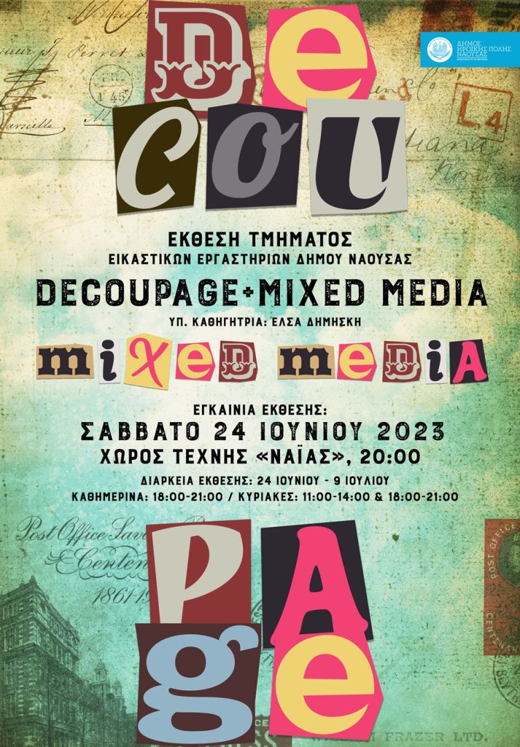 Το τμήμα ντεκουπάζ και μικτής τεχνικής (mixedmedia) των Εικαστικών Εργαστηρίων του Δήμου Νάουσας παρουσιάζειτις δημιουργίες των σπουδαστών του τμήματος του ακαδημαϊκού έτους 2022-2023 με την διδασκαλία και επιμέλεια της εκπαιδεύτριας κ. Έλσας Δημησκή.