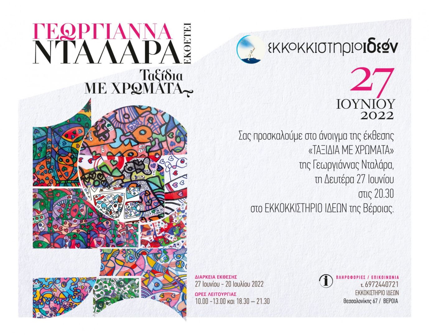 Είστε ΟΛΟΙ προσκεκλημένοι την Δευτέρα 27 Ιουνίου στις 8.30 μμ στο «‘Εκκοκκιστήριο Ιδεών» στα εγκαίνια της έκθεσης Ζωγραφικής της Γεωργιάννας ΝΤΑΛΑΡΑ « ΤΑΞΙΔΙ ΜΕ ΤΑ ΧΡΩΜΑΤΑ».