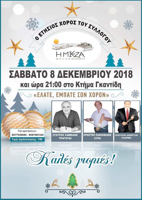 Το Δ/Σ του Μορφωτικού Σύλλογου «Η ΜΙΕΖΑ» Κοπανού, με χαρά σας προσκαλεί στον ετήσιο χορό που θα πραγματοποιηθεί στο ΚΤΗΜΑ-ΓΚΑΝΤΙΔΗ, το Σάββατο 8 Δεκεμβρίου 2018 και ώρα 21:00.