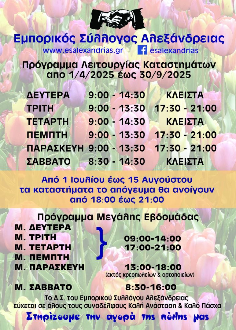 Ο Εμπορικός Σύλλογος Αλεξάνδρειας ανακοίνωσε το θερινό ωράριο λειτουργίας των καταστημάτων, το οποίο θα ισχύει από την 1η Απριλίου έως τις 30 Σεπτεμβρίου 2025. Επίσης ανακοίνωσε και το ωράριο λειτουργίας της Μεγάλης Εβδομάδας.