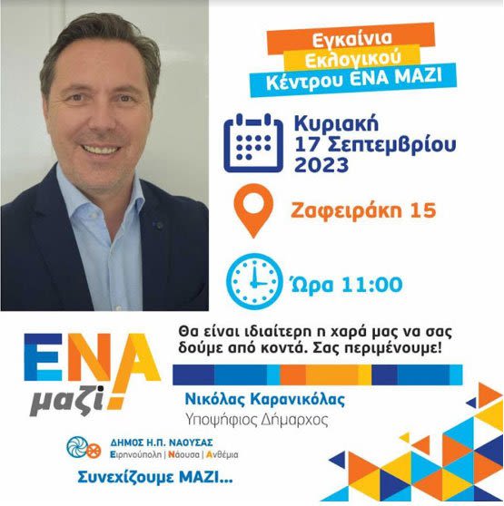 Την Κυριακή 17 Σεπτεμβρίου 2023, στις 11 το πρωί, θα πραγματοποιηθούν τα εγκαίνια του εκλογικού κέντρου του συνδυασμού «ΕΝΑ Μαζί», που βρίσκεται στην οδό Ζαφειράκη 15 στη Νάουσα