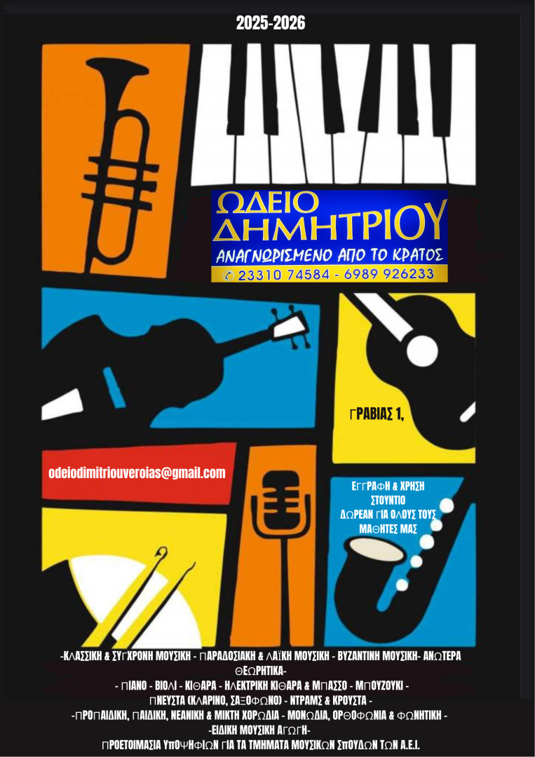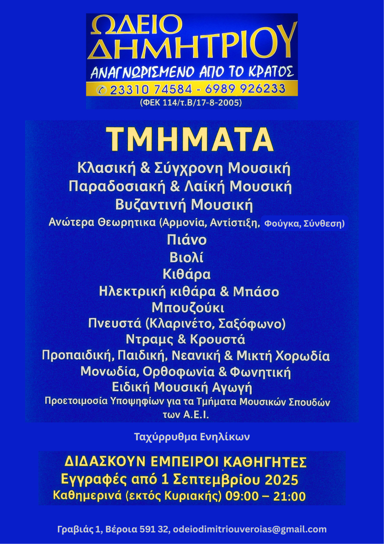 Το Ωδείο Δημητρίου, που ιδρύθηκε το 1980 από τον Νικόλαο Δημητρίου και αποτελεί έναν από τους σημαντικότερους φορείς μουσικής παιδείας στην περιοχή της Βέροιας, ανακοινώνει την έναρξη των εγγραφών για το νέο διδακτικό έτος 2025–2026.
