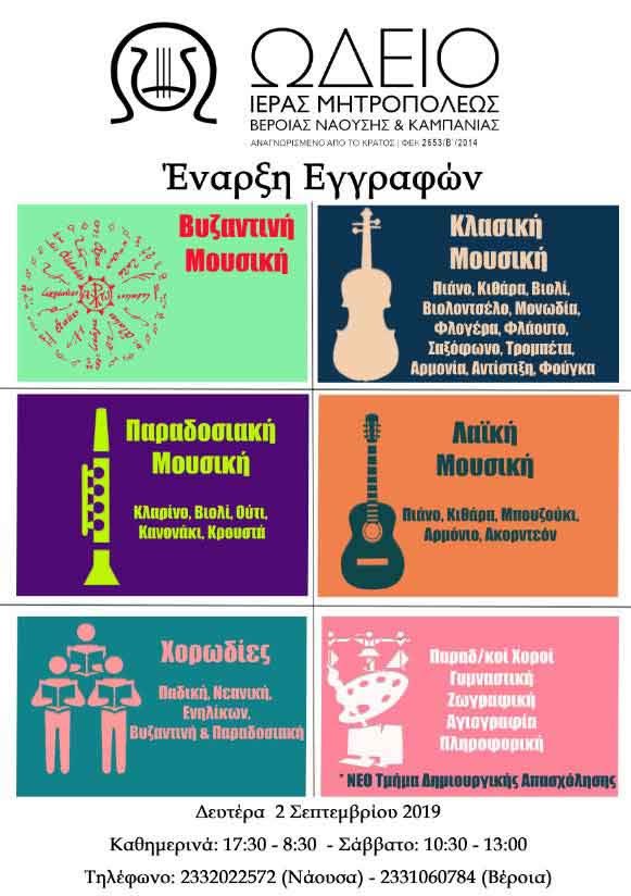 Από το Ωδείο και τη Σχολή Βυζαντινής Μουσικής της Ιεράς Μητροπόλεως Βεροίας, Ναούσης & Καμπανίας ανακοινώνεται ότι από την Δευτέρα 2 Σεπτεμβρίου 2019 αρχίζουν οι εγγραφές σε όλα τα τμήματα στην Βέροια & Νάουσα.