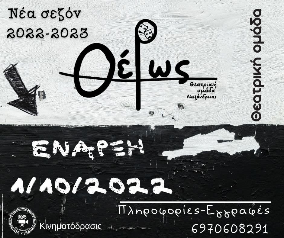 Η Λέσχη κινηματογράφου και πολιτισμού Αλεξάνδρειας ΚΙΝΗΜΑΤΟΔΡΑΣΙΣ, ανακοινώνει την έναρξη της νέας σεζόν της θεατρικής ομάδας Θέρως.