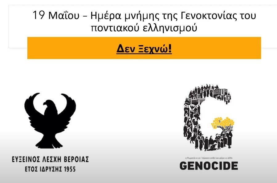 Πέρσι, παρά τους περιορισμούς, λόγω της νόσου covid-19, το Τμήμα Νέων της Ευξείνου Λέσχης Βέροιας δημιούργησε με σκοπό να σταλεί στα σχολεία του Δήμου για την ενημέρωση και ευαισθητοποίηση των μαθητών ως προς το θέμα της Γενοκτονίας των Ελλήνων του Πόντου, όπως και στα “παιδιά της Λέσχης” το παρακάτω βίντεο: