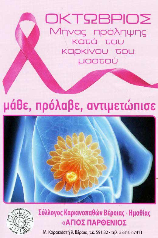 Οκτώβριος, μήνας πρόληψης κατά του καρκίνου του μαστού και κάθε χρόνο ο Σύλλογος Καρκινοπαθών Βέροιας-Ημαθίας «Άγιος Παρθένιος» διοργάνωνε εκδηλώσεις σε συνεργασία με το Δήμο και επιστημονικούς-κοινωνικούς φορείς του Νομού. Φέτος όμως η πανδημία του κορωνοϊού δεν επιτρέπει συναθροίσεις, συγκεντρώσεις και εκδηλώσεις. Έτσι, ο Σύλλογος περιορίζεται στην έντυπη ενημέρωση των πολιτών, επικεντρώνοντας στο κομμάτι της πρόληψης, ως όπλο ενάντια στον καρκίνο. Τα έντυπα διανέμονται σήμερα με τα φύλλα του «Λαού» που συνδράμει με τον τρόπο του στην προσπάθεια του Συλλόγου. Αναζητήστε το και διαβάστε το…