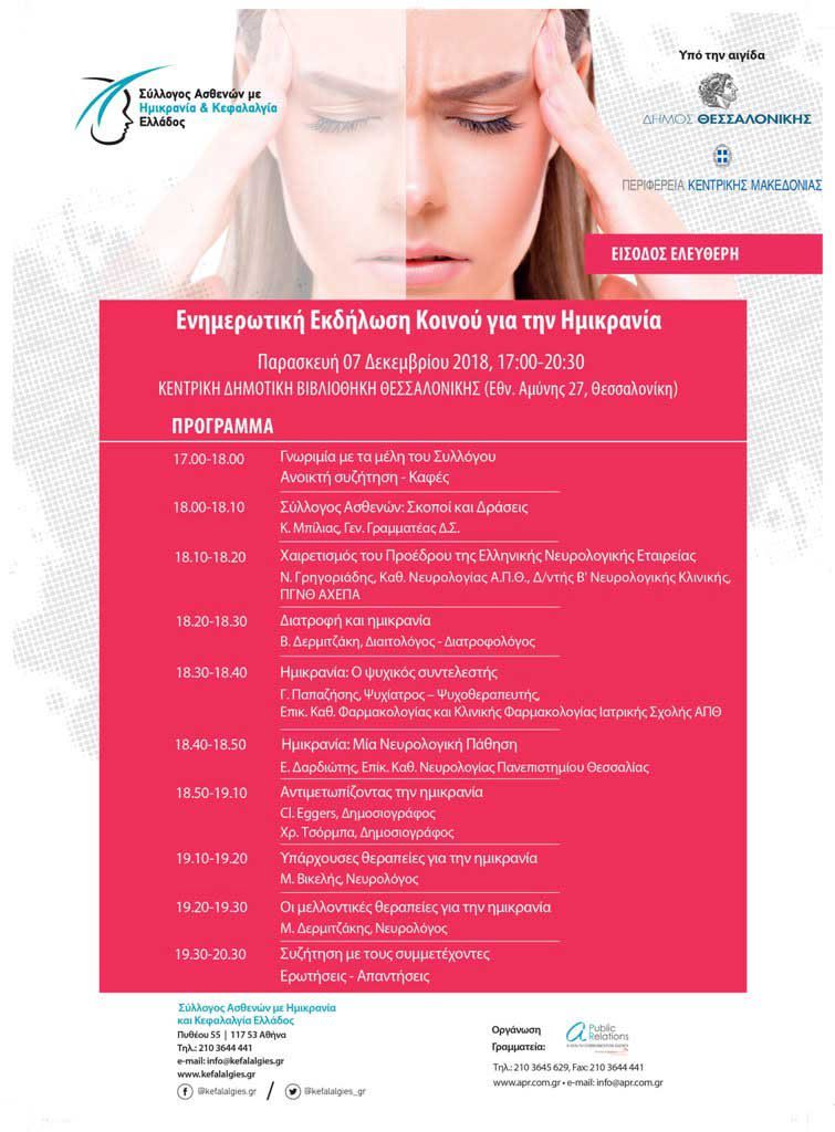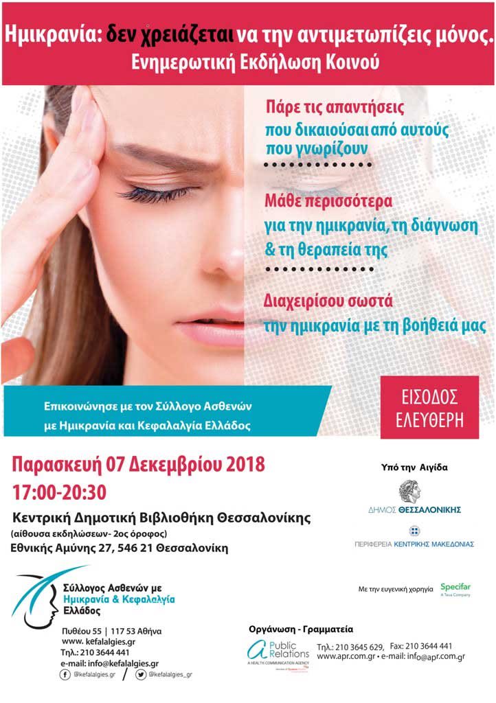 Ενημερωτική εκδήλωση με θέμα «Ημικρανία: Δεν χρειάζεται να την αντιμετωπίζεις μόνος» διοργανώνει ο Σύλλογος Ασθενών με Ημικρανία και Κεφαλαλγία Ελλάδος, την Παρασκευή 7 Δεκεμβρίου 2018 στην Κεντρική Δημοτική Βιβλιοθήκη (Εθνικής Αμύνης 27, Θεσσαλονίκη), από τις 17:00 ως τις 20:30.