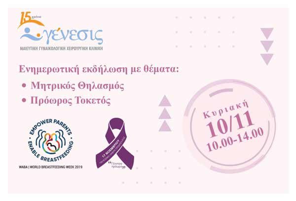 Με αφορμή την Παγκόσμια Εβδομάδα Μητρικού Θηλασμού, που στην Ελλάδα γιορτάζεται κάθε χρόνο από τις 1 έως τις 7 Νοεμβρίου, η Διεύθυνση Δημόσιας Υγείας και Κοινωνικής Μέριμνας της Περιφέρειας Κεντρικής Μακεδονίας θα συμμετάσχει σε δράση ενημέρωσης με θέμα το μητρικό θηλασμό και τα οφέλη του, καθώς και τον πρόωρο τοκετό. Η εκδήλωση θα πραγματοποιηθεί στη Θεσσαλονίκη, στο ιδιωτικό μαιευτήριο ΓΕΝΕΣΙΣ (αίθουσα επιστημονικών εκδηλώσεων), την Κυριακή 10 Νοεμβρίου 2019 (10.00-14.00).