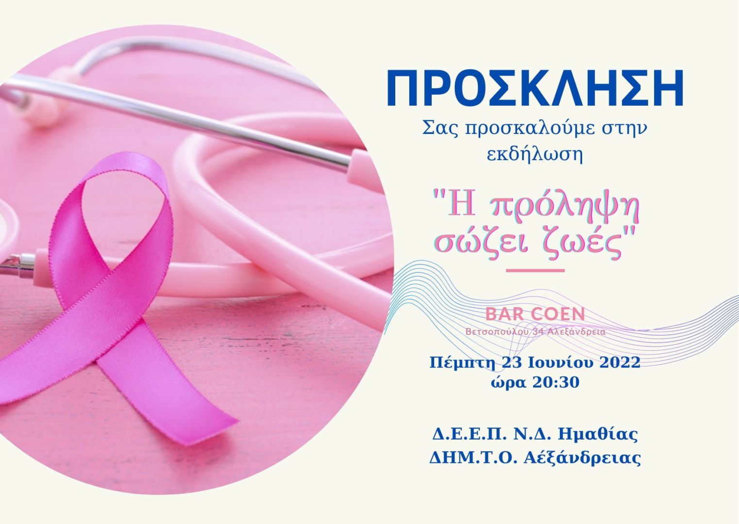 Στην εκδήλωση θα γίνει ενημέρωση και θα δοθούν απαντήσεις για την σπουδαιότητα της διαδικασίας του προσυμπτωματικού ελέγχου και τις δωρεάν εξετάσεις για τον καρκίνο του μαστού.