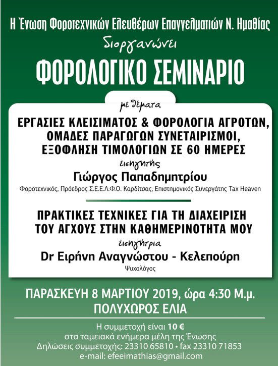 Το Διοικητικό Συμβούλιο της Ε.Φ.Ε.Ε. Νομού Ημαθίας, διοργανώνει φορολογικό σεμινάριο  την Παρασκευή 08 Μαρτίου 2019 στις 04:30 μ.μ. στο  Πολυχώρο της Ελιάς, πάρκο Ελιάς Βέροια.