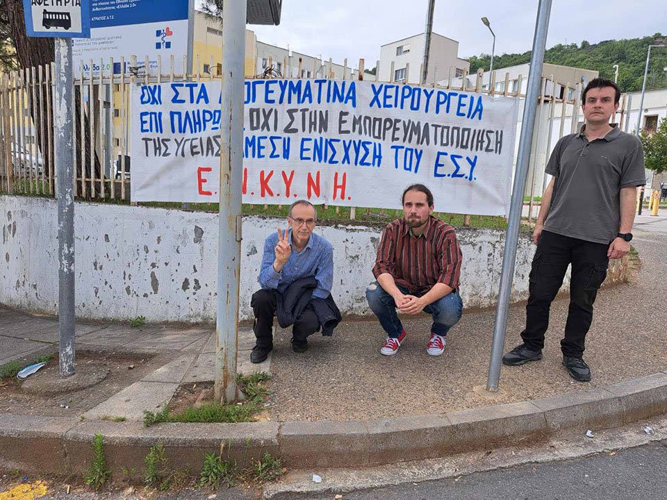 Στο πλαίσιο δράσης φορέων και σωματείων εργαζομένων που λαμβάνει χώρα τις τελευταίες ημέρες για την παύση της γενοκτονίας του παλαιστινιακού λαού η Ένωση Νοσοκομειακών Γιατρών και Κέντρων Υγείας του νομού Ημαθίας (Ε.Ι.Ν.Κ.Υ.Ν.Η.) προχώρησε χθες Τρίτη 21 Μαΐου, σε συμβολική ανάρτηση πανό έξω από το νοσοκομείο της Βέροιας, ζητώντας:-Την παύση της γενοκτονίας του παλαιστινιακού λαού από το κράτος του Ισραήλ.