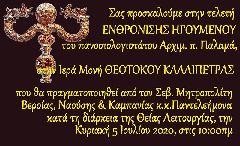 Επίσημη ενθρόνιση του Ηγουμένου της Μονής Καλλίπετρας Βέροιας Αρχιμ. Παλαμά Καλλιπετρίτη θα τελέσει ο Μητροπολίτης Βεροίας την Κυριακή 5 Ιουλίου 2020, στο καθολικό της Μονής.