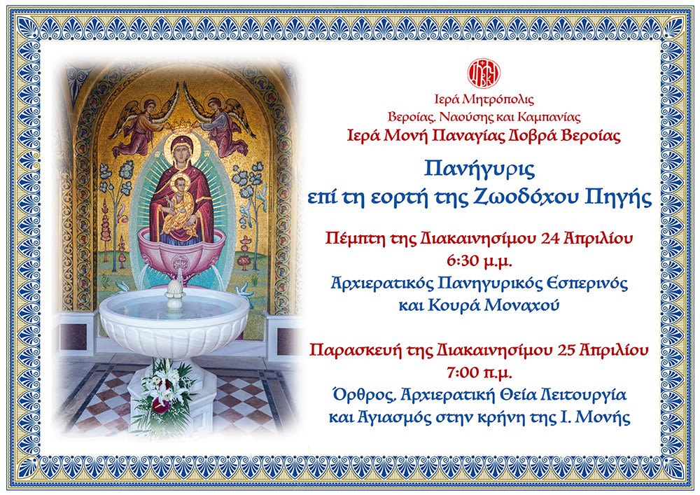 Την Παρασκευή της Διακαινησίμου εορτάζει και πανηγυρίζει η Ιερά Μονή Παναγίας Δοβρά Βεροίας, επί τη εορτή της Ζωοδόχου Πηγής, μιας από τις θεομητορικές εορτές της Υπεραγίας Θεοτόκου, η οποία αποτελεί και την κύρια πανήγυρη της Μονής.