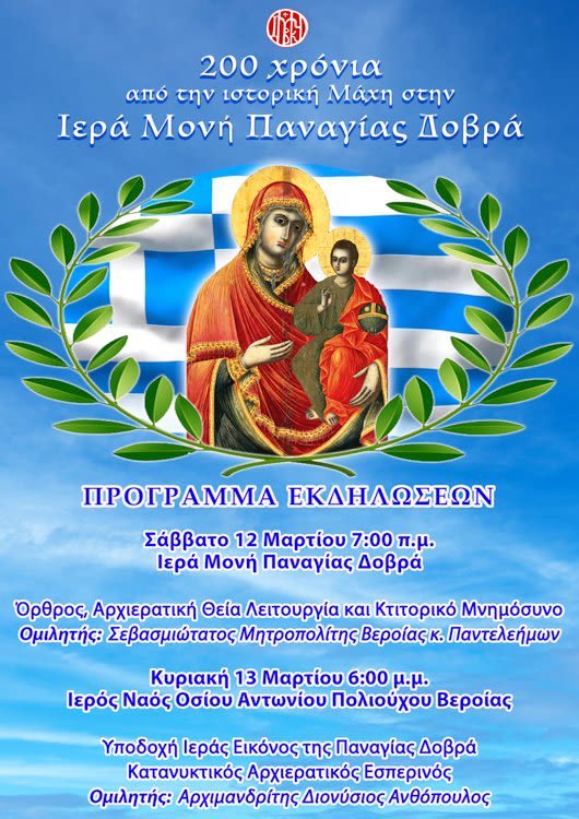 Η Ιερά Μονή της Παναγίας Δοβρά Βεροίας εορτάζει την επέτειο της συμπλήρωσης 200 ετών από την ιστορική Μάχη της Δοβρά και τον απαγχονισμό του ηγουμένου της Γερασίμου.