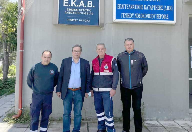 Όσον αφορά στο ΕΚΑΒ, ως κυριότερο πρόβλημα επισημάνθηκε η υποστελέχωσή του. Απαιτούνται το λιγότερο 50 άτομα για την επαρκή στελέχωση του ΕΚΑΒ Ημαθίας. Για καθένα ασθενοφόρο απαιτούνται τουλάχιστον 10 άτομα, ώστε να είναι λειτουργικό καθ’ όλο το έτος. Με 29 «μάχιμους» εργαζόμενους, το ΕΚΑΒ Ημαθίας δεν είναι σε θέση να καλύψει τις ανάγκες της Π.Ε. Ημαθίας. Είναι χαρακτηριστικό ότι πρόσληψη μονίμων έχει να γίνει από το μακρινό… 1998! Ελλείψεις υφίστανται και στα ασθενοφόρα, καθώς υπάρχουν μόλις 3 διαθέσιμα για άμεση δράση. Σημαντικό πρόβλημα αποτελεί η μακρά παραμονή των οχημάτων στα συνεργεία για την επισκευή τους. Είναι χαρακτηριστικό ότι για την αλλαγή μίας μίζας χρειάστηκαν 2 ολόκληροι μήνες! Εμφανές είναι το πρόβλημα και στις υποδομές, ενώ οι συνθήκες εργασίας χαρακτηρίστηκαν από τους ίδιους τους εργαζόμενους ως «τριτοκοσμικές». Τρεις προκηρύξεις για το επικουρικό προσωπικό δεν υλοποιήθηκαν και δεν προχώρησε η διαδικασία πρόσληψης των επιτυχόντων, καθώς οι σχετικές θέσεις είχαν ήδη καλυφθεί και δεν υπήρξε ανάλογη τροποποίηση της οικείας υπουργικής απόφασης, ώστε να καταστεί δυνατή η πρόσληψη και των υπολοίπων επιτυχόντων. Οι διασώστες του ΕΚΑΒ Ημαθίας έχουν ήδη υποβάλει έγγραφη αναφορά στην Εισαγγελία Πρωτοδικών Βέροιας, ενώ παράλληλα υπέβαλαν και σχετικό υπόμνημα στον υφυπουργό Βεσυρόπουλο, με το οποίο επισημαίνουν τις παραπάνω ελλείψεις. Ωστόσο, ο τελευταίος περιορίστηκε, όπως δήλωσαν, να ασκήσει καθήκοντα… αγγελιαφόρου και προώθησε το υπόμνημά τους στα… συρτάρια των Αθηνών.