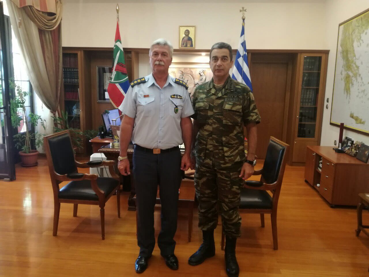 Στα πλαίσια εθιμοτυπικών επισκέψεων, ο νέος Διευθυντής της Διεύθυνσης Αστυνομίας Ημαθίας, Αστυνομικός Διευθυντής ΚΟΥΓΚΑΣ Διονύσιος, επισκέφθηκε σήμερα το πρωί, τον Ανώτερο Διοικητή Φρουράς της Ημαθίας, Διοικητή Ι ΜΠ Υποστράτηγο ΚΟΛΟΚΟΥΡΗ Σάββα.