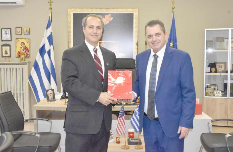 Στο πέρας της συνάντησης, ο κ. Καλαϊτζίδης χάρισε στον Αμερικανό Πρόξενο το επίχρυσο βιβλίο εθιμοτυπίας με τους αρχαιολογικούς θησαυρούς των Αιγών, ο οποίος ανταπέδωσε με αντίστοιχο δώρο εθιμοτυπίας των ΗΠΑ.