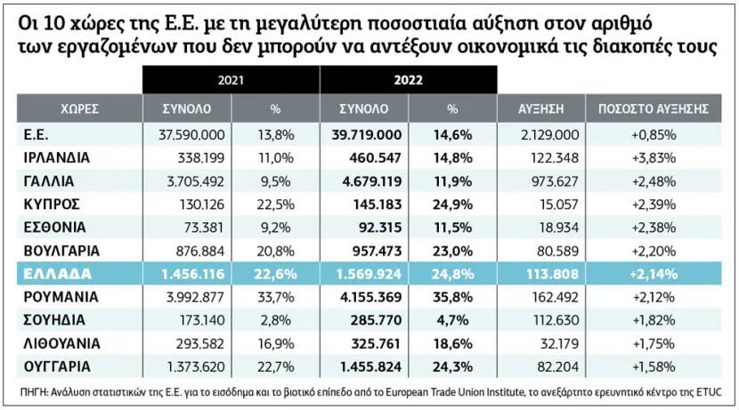 Η μεγαλύτερη αύξηση της φτώχειας στις διακοπές, σύμφωνα με την έρευνα της ETUC, σημειώθηκε στη Γαλλία, όπου σχεδόν ένα εκατομμύριο περισσότεροι μισθωτοί αναγκάστηκαν το 2022 να μείνουν στο σπίτι. Οι μεγαλύτερες ποσοστιαίες αλλαγές σε σχέση με το 2021 σημειώθηκαν στην Ιρλανδία (+3,8%) και στη Γαλλία (+2,5%). Η Ιταλία εξακολουθεί να έχει τον υψηλότερο αριθμό εργαζομένων που δεν μπορούν να αντέξουν οικονομικά ένα διάλειμμα (6.074.387) από την εργασία, παρά τη μείωση σε σχέση με το 2021.
