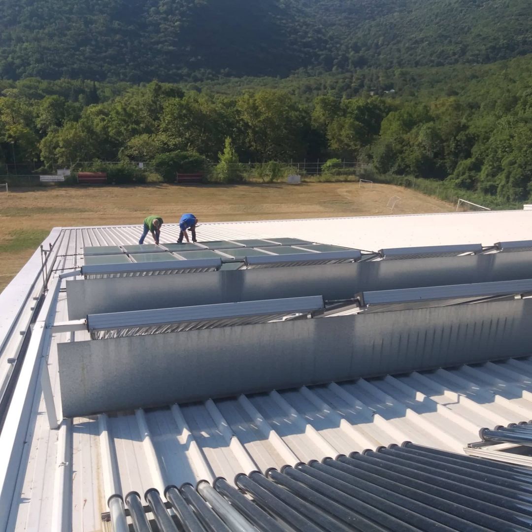 συλλέκτες στη στέγη του Δημοτικού Κολυμβητηρίου Νάουσας ενώ παράλληλα στο
