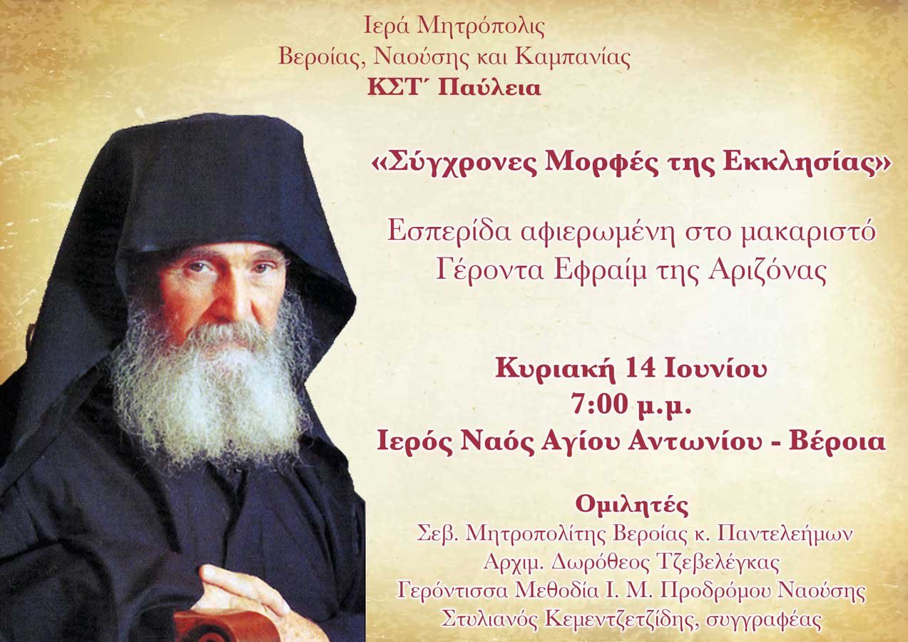 Τήν Κυριακή 14 Ἰουνίου στίς 7 μ.μ. στόν Ἱερό Ναό Ἁγίου Ἀντωνίου Πολιούχου Βεροίας θά πραγματοποιηθεῖ ἡ ἐκδήλωση τῶν ΚΣΤ’ Παυλείων μέ τίτλο Σύχρονες Μορφές τῆς Εκκλησίας, μιά ἑσπερίδα ἀφιερωμένη στό μακαριστό Γέροντα Ἐφραίμ τῆς Ἀριζόνας. Ὁμιλητές: Σεβασμιώτατος Μητροπολίτης Βεροίας κ. Παντελεήμων, Ἀρχιμ. Δωρόθεος Τζεβελέγκας, Καθηγούμενος Ι.Μ. Ἁγ. Γεωργίου Αὔρας, Μοναχή Μεθοδία, Καθηγουμένη Ι.Μ. Προδρόμου Ναούσης καί Στυλιανός Κεμεντζετζίδης, συγγραφέας.