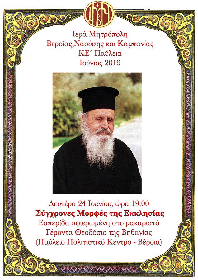 Στο πλαίσιο των ΚΕ΄ Παυλείων την Δευτέρα 24 Ιουνίου στις 19:00 μ.μ. στο Παύλειο Πολιτιστικό Κέντρο στη Βέροια θα πραγματοποιηθεί Εσπερίδα με τίτλο: «Σύγχρονες Μορφές της Εκκλησίας», η οποία είναι αφιερωμένη στο μακαριστό Γέροντα Θεοδόσιο της Βηθανίας.