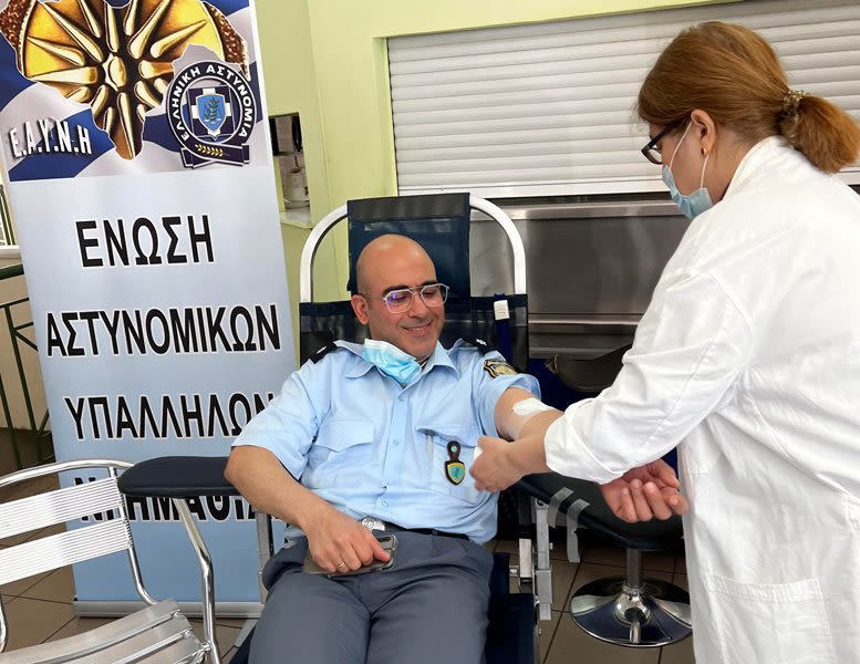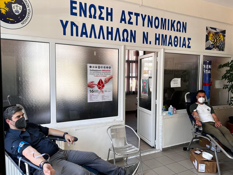 Συγκινητική ήταν η προσέλευση των μελών μας στο κάλεσμα της Ένωσης Αστυνομικών Υπαλλήλων Νομού Ημαθίας στην εθελοντική αιμοδοσία που πραγματοποιήθηκε στην έδρα της Διεύθυνσης Αστυνομίας Ημαθίας, σήμερα Δευτέρα 16 Μαΐου 2022, με συνδιοργανωτές την Ένωση Αξιωματικών Κεντρικής Μακεδονίας και τους Εθελοντές Δότες Μυελού των Οστών.