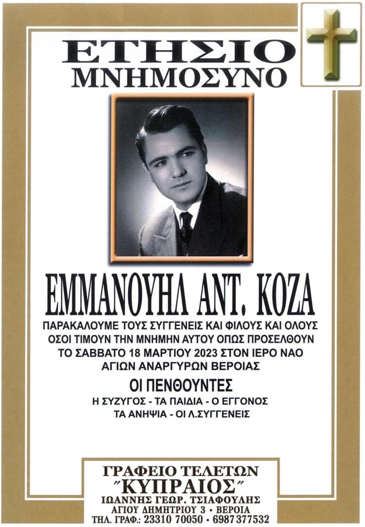 Ετήσιο Μνημόσυνο του Εμμανουήλ Κόζα θα τελεστεί το Σάββατο 18 Μαρτίου 2023 στον Ιερό Ναό Αγίων Αναργύρων Βέροιας.
