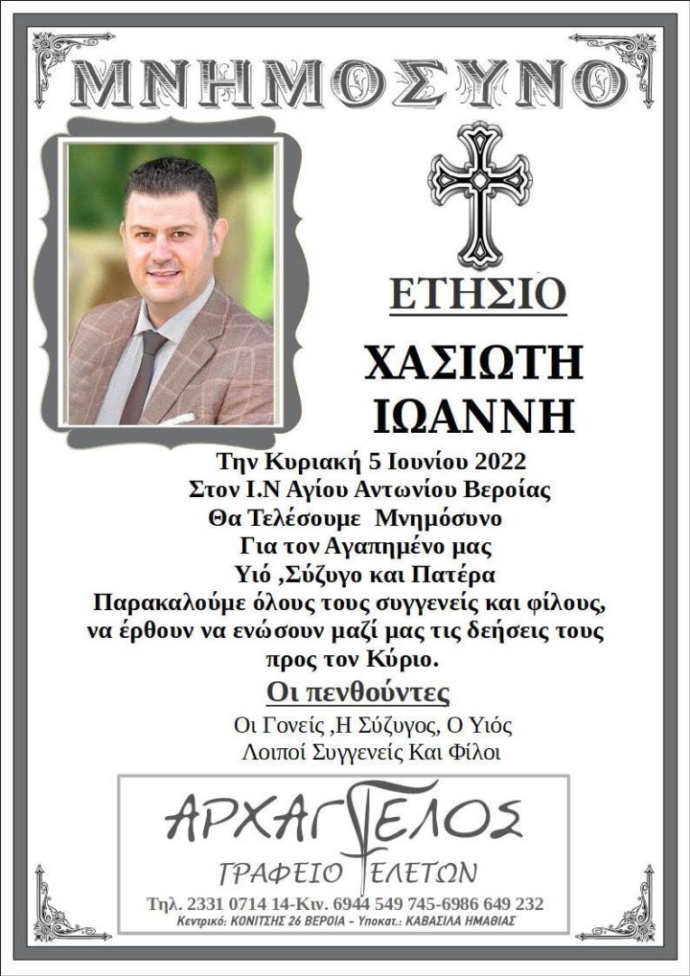 Την Κυριακή 5 Ιουνίου 2022 στον Ιερό Ναό Αγίου Αντωνίου Βέροιας θα τελεστεί Ετήσιο μνημόσυνο για τον Ιωάννη Χασιώτη. Παρακαλούνται οι συγγενείς και φίλοι να έρθουν να ενώσουν μαζί με τους οικείους, τις δεήσεις προς τον Κύριο.