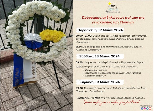 8.00 μ. μ. – 9.00 μ. μ. : Ομιλία από τον διδάκτορα του πανεπιστημίου Πρίνστον κ. Νίκο Μιχαηλίδη με θέμα: <<Γενοκτονία του Ποντιακού Ελληνισμού: Ένα ατιμώρητο έγκλημα και οι συνέπειες του>> στην αίθουσα συνεδριάσεων του δημοτικού συμβουλίου δήμου Βέροιας.