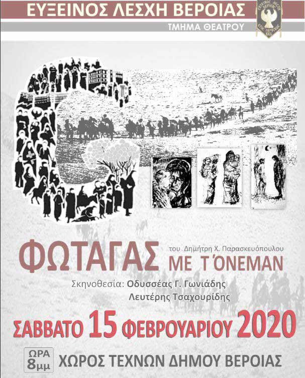 Η Εύξεινος Λέσχη Βέροιας, το Σάββατο 15 Φεβρουαρίου 2020 και ώρα 20:00, θα παρουσιάσει στο Χώρο Τεχνών του Δήμου Βέροιας,την ποντιακή θεατρική παράσταση ιστορικού περιεχομένου με τίτλο, «Ο Φώταγας με τ’ όνεμαν»