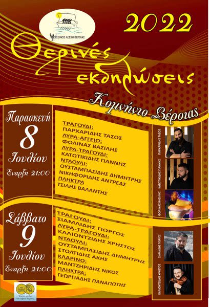 Γι΄ αυτό το λόγο συνεχίζοντας την προσπάθειά μας για την διάδοση και διατήρηση της πολιτιστικής μας κληρονομιάς, θα πραγματοποιήσουμε θερινές μουσικοχορευτικές εκδηλώσεις στις 8 & 9 Ιουλίου 2022, στο Κομνήνιο Βέροιας.