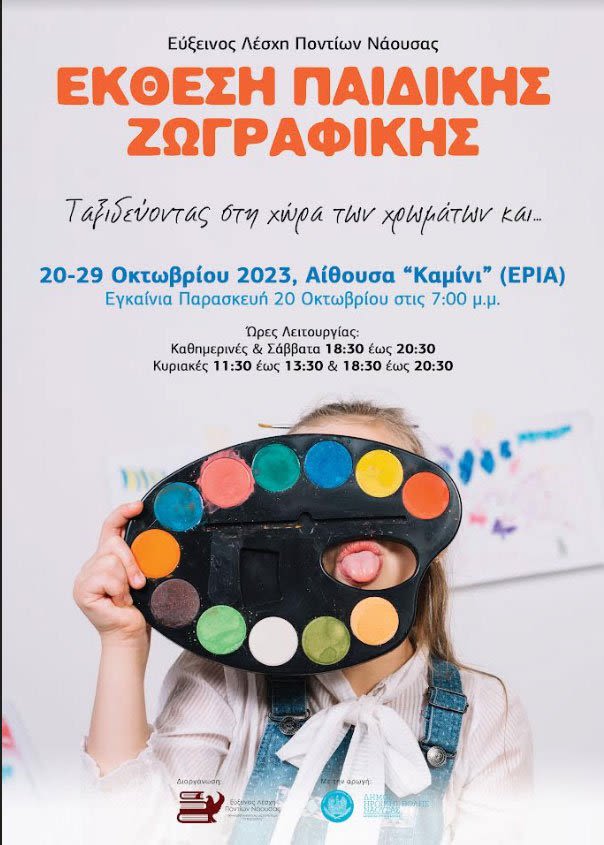 Η Εύξεινος Λέσχη Ποντίων Νάουσας – Εθνική Βιβλιοθήκη Αργυρουπόλεως «Ο Κυριακίδης» σας προσκαλεί στα εγκαίνια της 4ης έκθεσης παιδικής ζωγραφικής, του τμήματος ζωγραφικής του σωματείου, τα οποία θα πραγματοποιηθούν την Παρασκευή 20 Οκτωβρίου 2023 και ώρα 7:00 μ.μ. στην Αίθουσα «Καμίνι» του Πολυχώρου Πολιτισμού Χρήστος Λαναράς (ΕΡΙΑ).