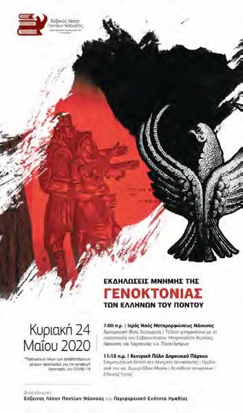Η Εύξεινος Λέσχη Ποντίων Νάουσας – Εθνική Βιβλιοθήκη Αργυρουπόλεως «Ο Κυριακίδης» και η Περιφερειακή Ενότητα Ημαθίας, τι- μώντας την ημέρα Μνήμης της Γενοκτονίας του Ποντιακού Ελληνισμού, διοργανώνουν Εκδηλώσεις Μνήμης της Γενοκτονίας των Ελλήνων του Πόντου την Κυριακή 24 Μαΐου 2020. Το πρόγραμμα των εκδηλώσεων έχει ως εξής: 7:00 π.μ. | Ιερός Ναός Μεταμορφώσεως του Σωτήρος Νάουσας Αρχιερατική Θεία Λει- τουργία | Τέλεση μνημοσύνου με τη χοροστασία του Σεβασμιότατου Μητροπολίτη Βεροίας, Ναούσης και Καμπανίας κ.κ. Παντελεή-