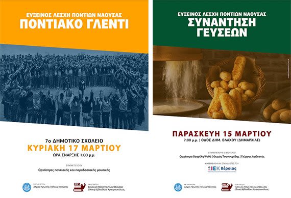 Επίσης, την Παρασκευή 15 Μαρτίου, από τις 7:00 μ.μ. η Εύξεινος Λέσχη Ποντίων Νάουσας διοργανώνει την «Συνάντηση Γεύσεων», στην οδό Δημ. Βλάχου (Δημαρχίας). Μία πρωτοβουλία στο πλαίσιο των εκδηλώσεων Αποκριάς, σε συνεργασία με το Δ.Ι.Ε.Κ. Βέροιας (Τεχνικός Μαγειρικής Τέχνης – Αρχιμάγειρας).