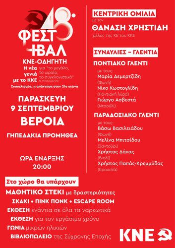 Την Παρασκευή 9 Σεπτεμβρίου το 48ο Φεστιβάλ ΚΝΕ-«Οδηγητή» κάνει τη στάση του στο Νομό Ημαθίας, στην πόλη της Βέροιας! Οι εκδηλώσεις φέτος θα πραγματοποιηθούν σε νέο χώρο, στα γηπεδάκια Προμηθέα, από τις 19:30 μ.μ