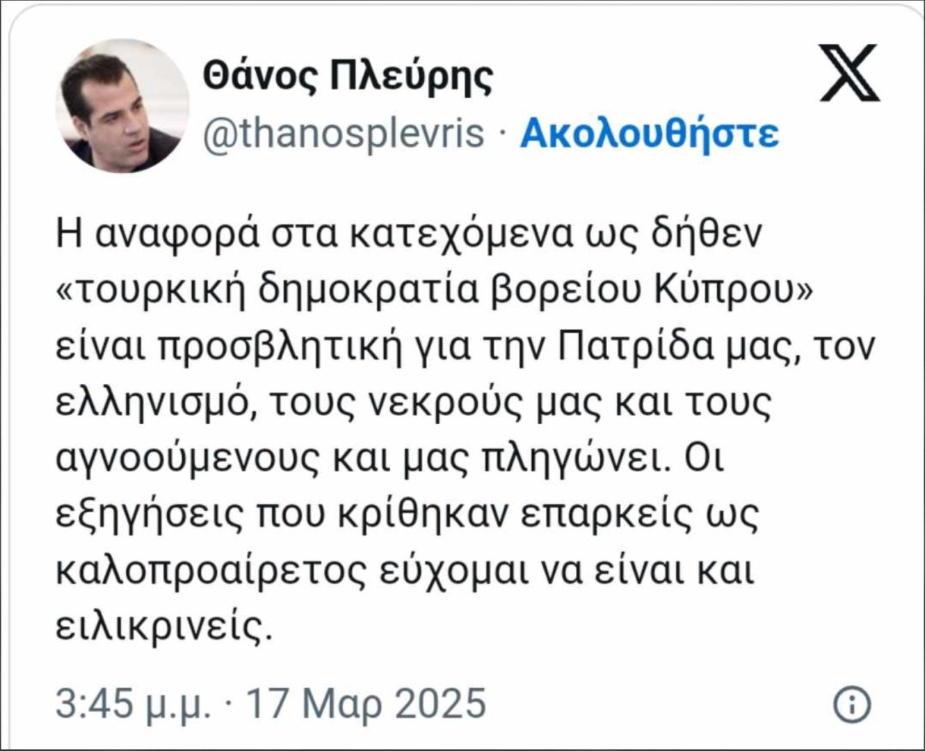 Ο Θάνος Πλεύρης σε ανάρτησή του σχολίασε πως «η αναφορά στα κατεχόμενα ως δήθεν «τουρκική δημοκρατία βορείου Κύπρου» είναι προσβλητική για την Πατρίδα μας, τον ελληνισμό, τους νεκρούς μας και τους αγνοούμενους και μας πληγώνει». Συνεχίζει ωστόσο λέγοντας πως «οι εξηγήσεις του κρίθηκαν επαρκείς ως καλοπροαίρετος εύχομαι να είναι και ειλικρινείς».