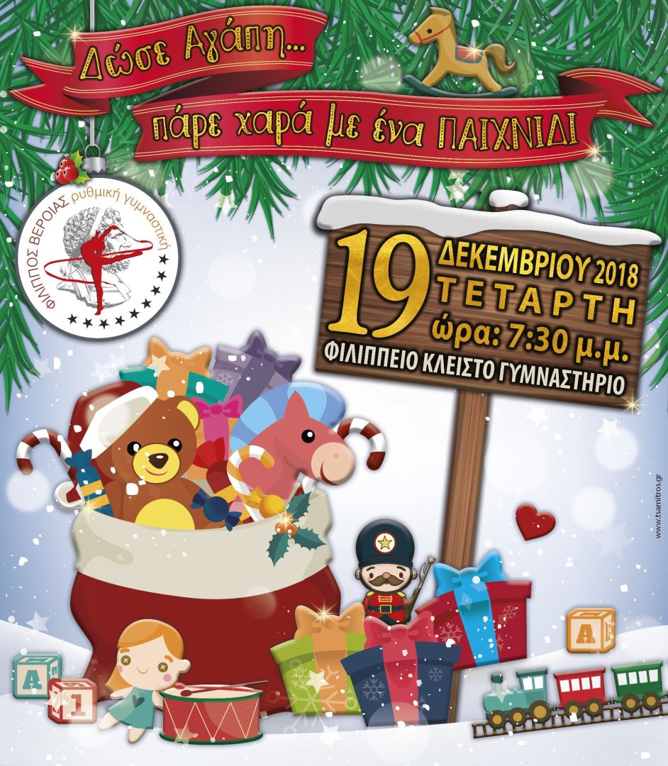 την καθιερωμένη γιορτή εν όψει των Χριστουγέννων διοργανώνει το τμήμα ρυθμικής γυμναστικής του Φιλίππου Βέροιας την Τετάρτη 19 Δεκεμβρίου στο ΦΙΛΙΠΠΕΙΟ . ώρα 7.30 μ.μ με το σύνθημα Δώσε αγάπη… πάρε χαρά με ένα παιχνίδι…