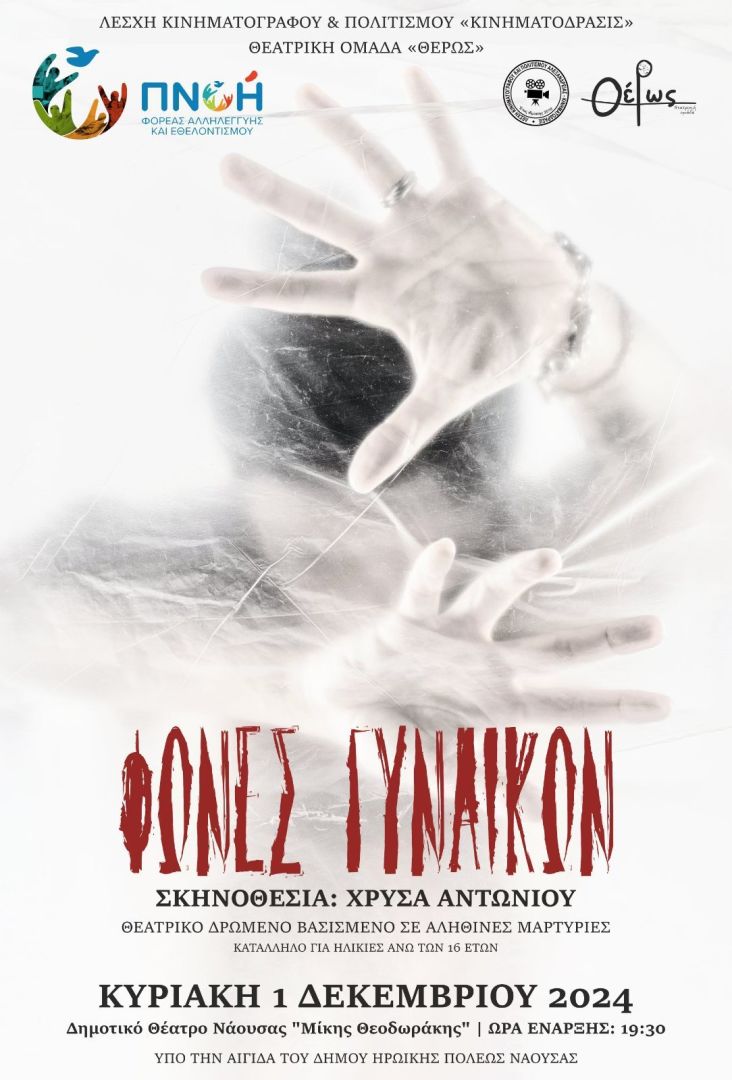 Με αφορμή την Διεθνή Ημέρα Εξάλειψης της Βίας κατά των Γυναικών στις 25 Νοεμβρίου η θεατρική ομάδα ΘΕΡΩΣ της Λέσχης Κινηματογράφου και Πολιτισμού Αλεξάνδρειας συμμετέχει στο πρόγραμμα εκδηλώσεων του Φορέα Κοινωνικής Αλληλεγγύης & Εθελοντισμού ΠΝΟΗ. Στο πλαίσιο αυτό την Κυριακή 1/12 στο Δημοτικό Θέατρο Νάουσας «Μίκης Θοδωράκης» στις 19:30 θα παρουσιαστεί το θεατρικό δρώμενο ΦΩΝΕΣ ΓΥΝΑΙΚΩΝ σε σκηνοθεσία Χρύσας Αντωνίου.