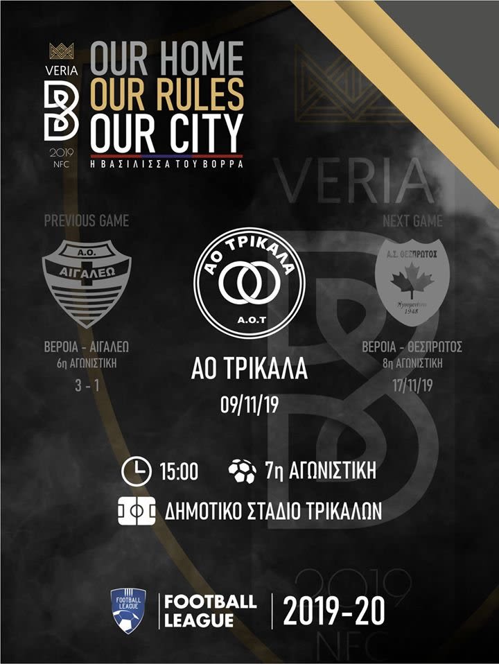 Στα πλαίσια της 7ης αγωνιστικής ( Σάββατο 9/11/2019 ώρα 15.00) ο ΝΠΣ Βέροια θα αντιμετωπίσει στα Τρίκαλα την τοπική ομάδα με στόχο ένα πολύ θετικό αποτέλεσμα . Ο αγώνας θα ξεκινήσεις τις 3 μ.μ και θα μεταδοθεί απευθείας από την ΕΡΤ3