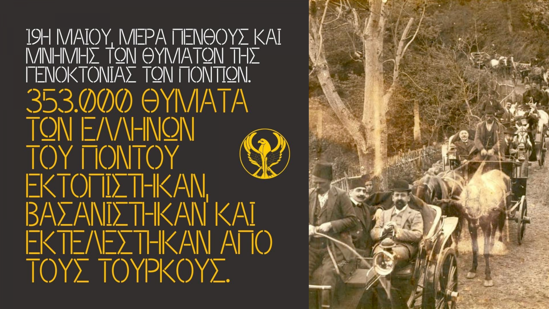 Σήμερα τιμούμε τους νεκρούς μας. Αποτίουμε φόρο τιμής στα θύματα, διεκδικούμε τη διεθνή αναγνώριση της γενοκτονίας, τη δικαίωση του Ποντιακού Ελληνισμού. Απαιτούμε από την πολιτική και πνευματική ηγεσία της Τουρκίας την αναγνώριση των διωγμών και των δραματικών συνεπειών τους.