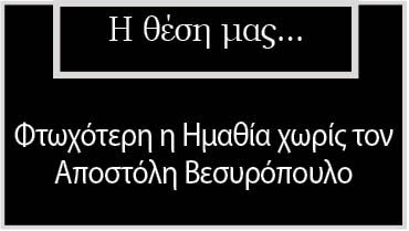 Η σοκαριστική είδηση του αιφνίδιου θανάτου του Αποστόλη Βεσυρόπουλου, έγινε χθες πρώτη είδηση πανελλαδικά, ενώ η Ημαθία γίνεται φτωχότερη με τη μεγάλη απώλεια. Έφυγε ένας νέος και δραστήριος άνθρωπος, που σχεδόν για μια 20ετια(από το 2007) κέρδισε την αγάπη και την εμπιστοσύνη των συμπολιτών του, που τον εξέλεξαν τα πρώτα χρόνια στην Τοπική Αυτοδιοίκηση και μετέπειτα στην Βουλή, εκπροσωπώντας επάξια την Ημαθία. Είναι αξιοσημείωτος ο ενθουσιασμός που διατηρούσε παρά την μεγάλη πολιτική διαδρομή του, να διεκδικεί και να πετυχαίνει πράγματα για την Ημαθία.