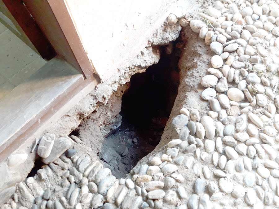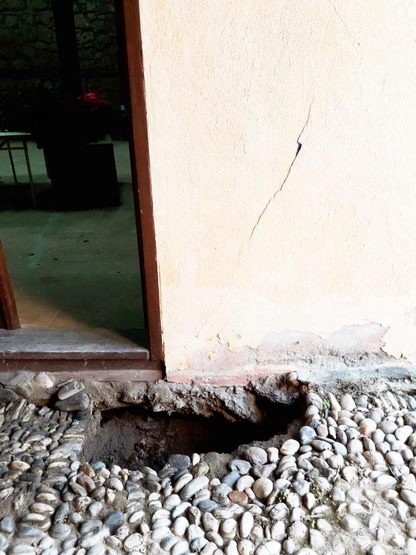 Αυτό σταμάτησε όταν δημιουργήθηκε μια τρύπα στο λιθόστρωτο, σε συνδυασμό με ρωγμές στον τοίχο. Ζητήθηκε από την πλευρά μας επανειλημμένα από την τεχνική υπηρεσία, να αξιολογήσει το πρόβλημα και να παρέμβει για την αποκατάσταση της ζημιάς. Και βέβαια η παρέμβαση θα σήμαινε και την προστασία του μοναδικού λιθόστρωτου του κτιρίου. Καμιά ανταπόκριση, “φωνή βοώντος εν τη ερήμω”  !