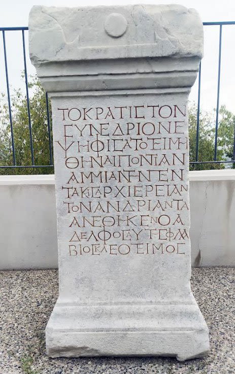 Εκτός από τον ανδριάντα που αφιέρωσε στις Μούσες η βασίλισσα των Μακεδόνων Ευρυδίκη (4ος αι. π.Χ.), τον οποίο υπέθεσα ότι δείχνει με τη χρήση της δεικτικής αντωνυμίας «τόνδε» στο επίγραμμα που ήταν χαραγμένο στο βάθρο του, η λέξη ανδριάντας για ολόσωμο γλυπτό γυναίκας χρησιμοποιείται και σε έναν τιμητικό βωμό του 2ου μ.Χ. αιώνα αφιερωμένο στην αρχιέρεια της τοπικής αυτοκρατορικής λατρείας ή του Κοινού των Μακεδόνων, της Ποντίας Αμμίας.