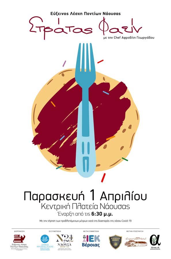 Η Εύξεινος Λέσχη Ποντίων Νάουσας – Εθνική Βιβλιοθήκη Αργυρουπόλεως «Ο Κυριακίδης», διοργανώνει την γαστρονομική εκδήλωση «Στράτας Φαείν», την Παρασκευή 1 Απριλίου 2022 από τις 6:30 το απόγευμα και μετά, στην κεντρική πλατεία της Νάουσας (πλατεία Καρατάσου).