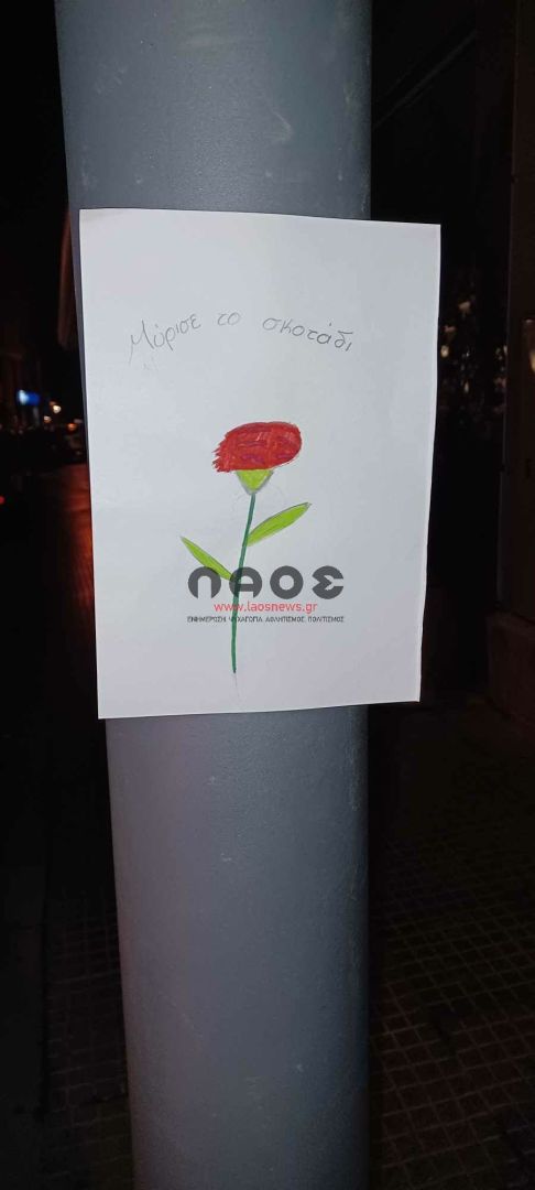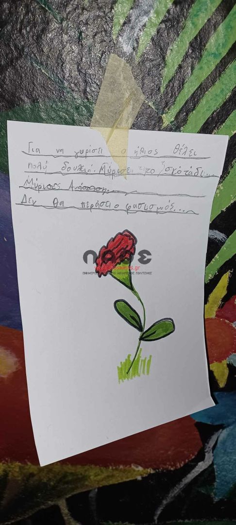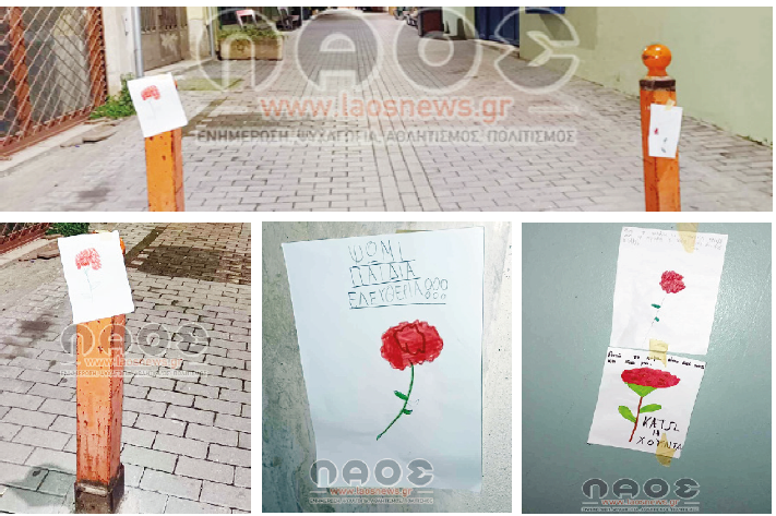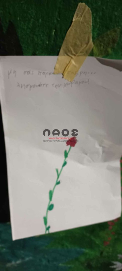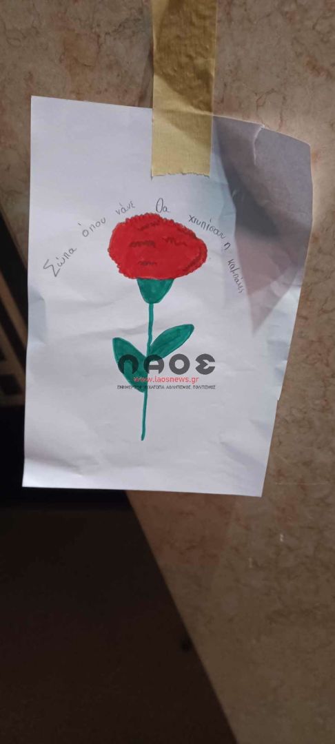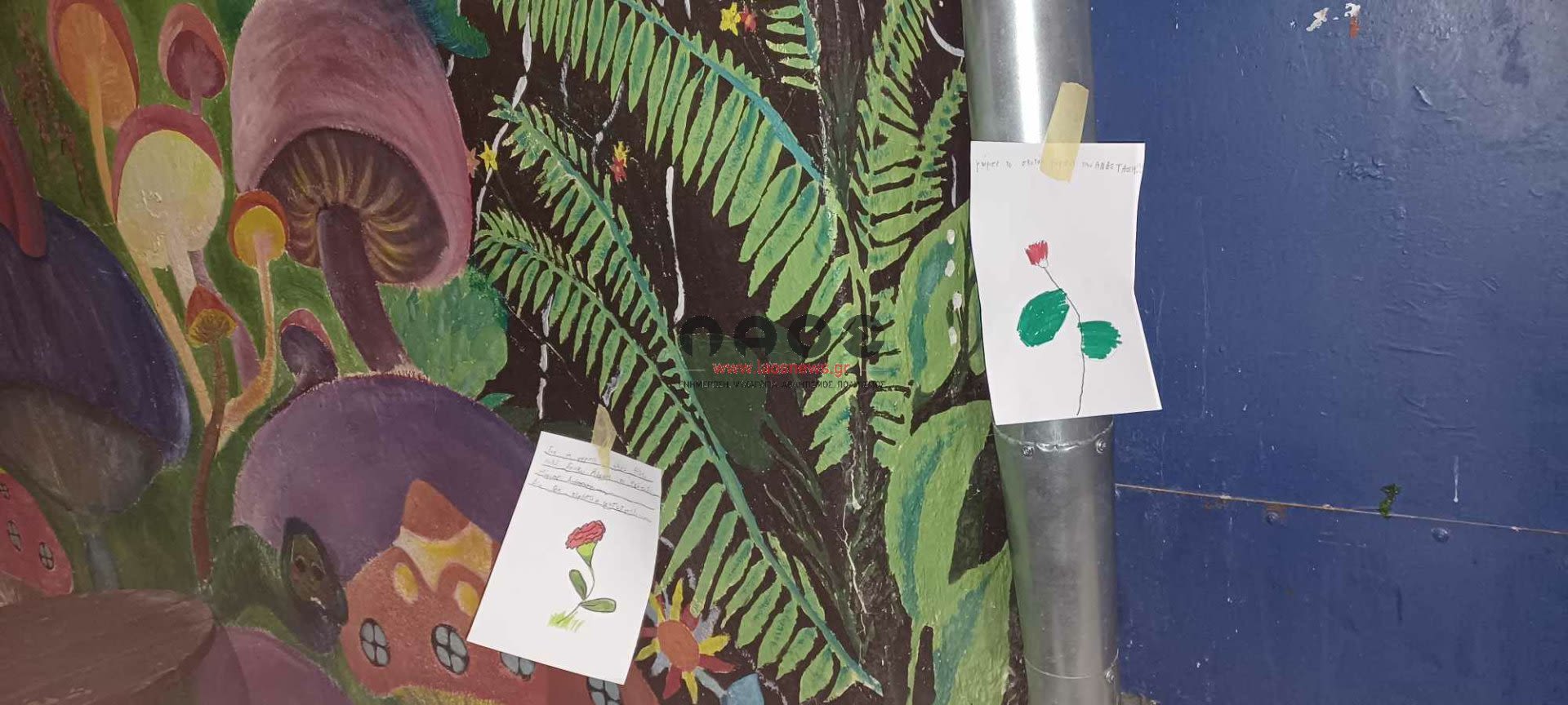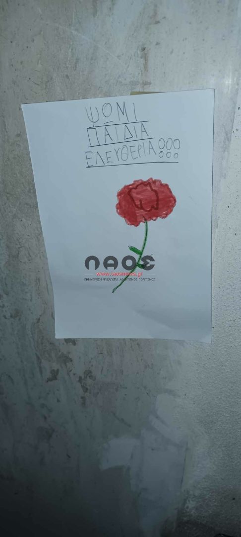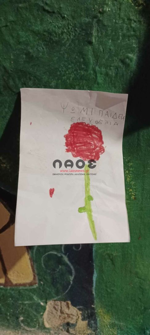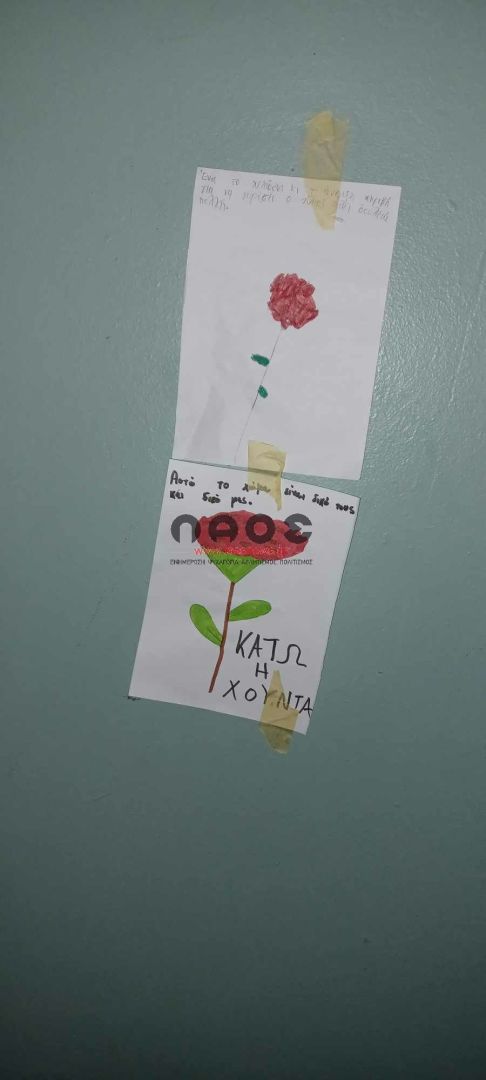 Μπροστά ακριβώς από το σχολείο υπήρχαν τοιχοκολλημένες ζωγραφιές των παιδιών με κόκκινα γαρίφαλα και εμβληματικούς στίχους και συνθήματα για την επέτειο της εξέγερσης των φοιτητών στο Πολυτεχνείο. «ΚΑΤΩ Η ΧΟΥΝΤΑ», «Αυτό το χώμα είναι δικό τους και δικό μας», «Σώπα όπου νάνε θα χτυπήσουν οι καμπάνες», «μη σας παρακαλώ σας μη…λησμονάτε την χώρα μου!», «ΨΩΜΙ ΠΑΙΔΕΙΑ ΕΛΕΥΘΕΡΙΑ», «Για να γυρίσει ο ήλιος θέλει πολύ δουλειά. Μύρισε το σκοτάδι. Μύρισε Ανάσταση. Δεν θα περάσει ο φασισμός».