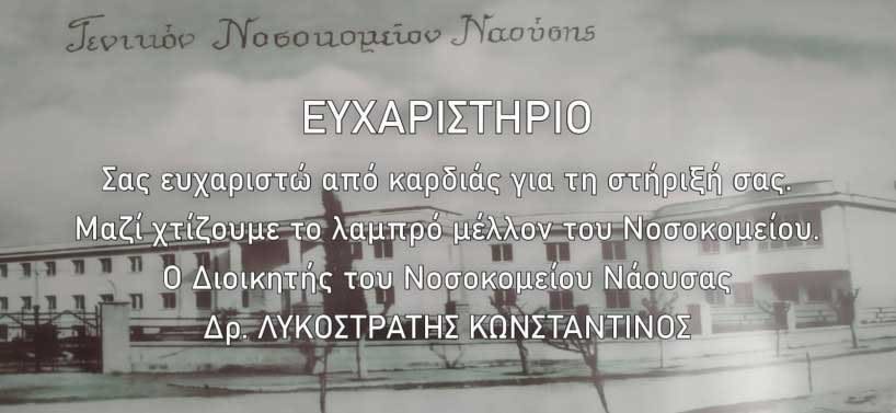 Είμαστε βαθιά ευγνώμονες για τη στήριξη του Συλλόγου Φίλων Νοσοκομείου Νάουσας και ευελπιστούμε στη συνέχιση της εξαιρετικής αυτής συνεισφοράς του και σε κάθε δυνατή μελλοντική συνεργασία μας.