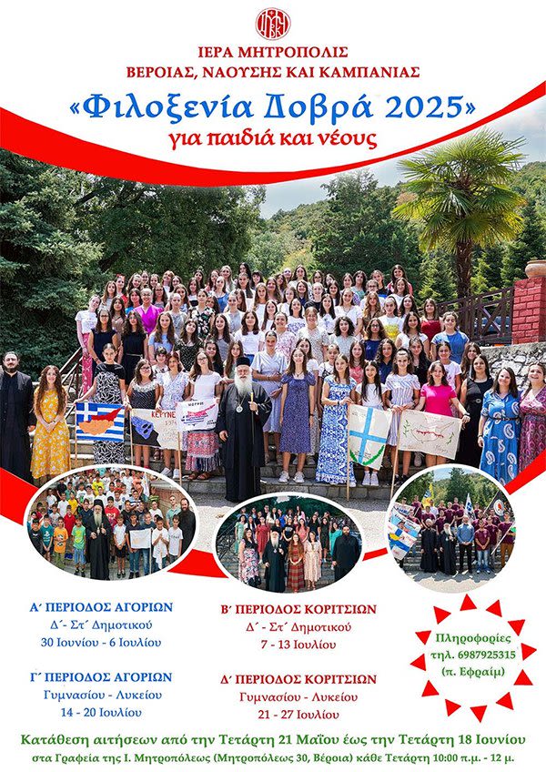 Ο Σεβασμιώτατος Μητροπολίτης μας κ. Παντελεήμων σας προτρέπει να ενθαρρύνετε τα παιδιά σας να συμμετέχουν στη «Φιλοξενία» στις εγκαταστάσεις της Ιεράς Μονής Παναγίας Δοβρά Βεροίας, για να έχουν την ευκαιρία να γνωρίσουν τις αλήθειες της πίστεως μας, να αποκτήσουν εμπειρία κοινοτικής ζωής και φιλίες, να εξασκηθούν σωματικά και να ωφεληθούν πνευματικά.
