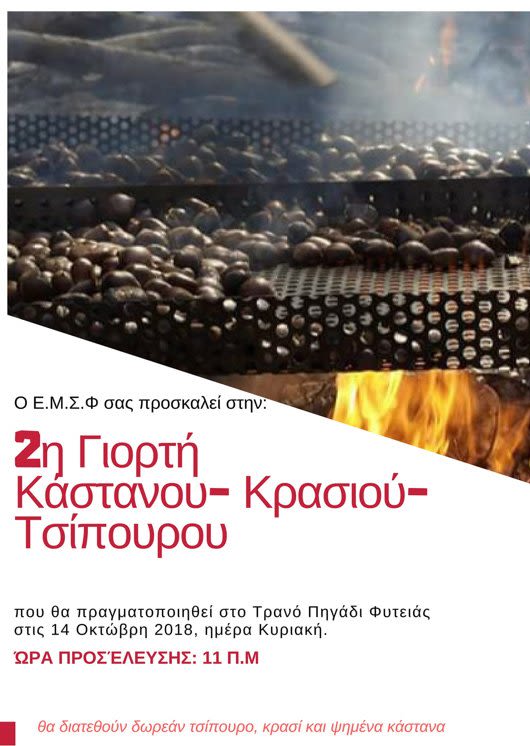 Ο Εκπολιτιστικός και Μορφωτικός Σύλλογος Φυτειάς διοργανώνει γιορτή τοπικών παραδοσιακών προϊόντων που διοργανώνει, με θέμα : « Κάστανο, κρασί & τσίπουρο» την Κυριακή 14 Οκτωβρίου ώρα 11.00 πμ, τοποθεσία Τρανό Πηγάδι, Φυτειά.