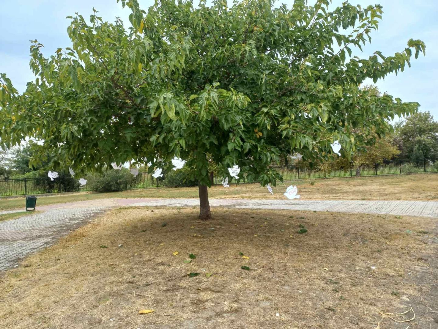 δέντρα του σχολείου λευκά περιστέρια με